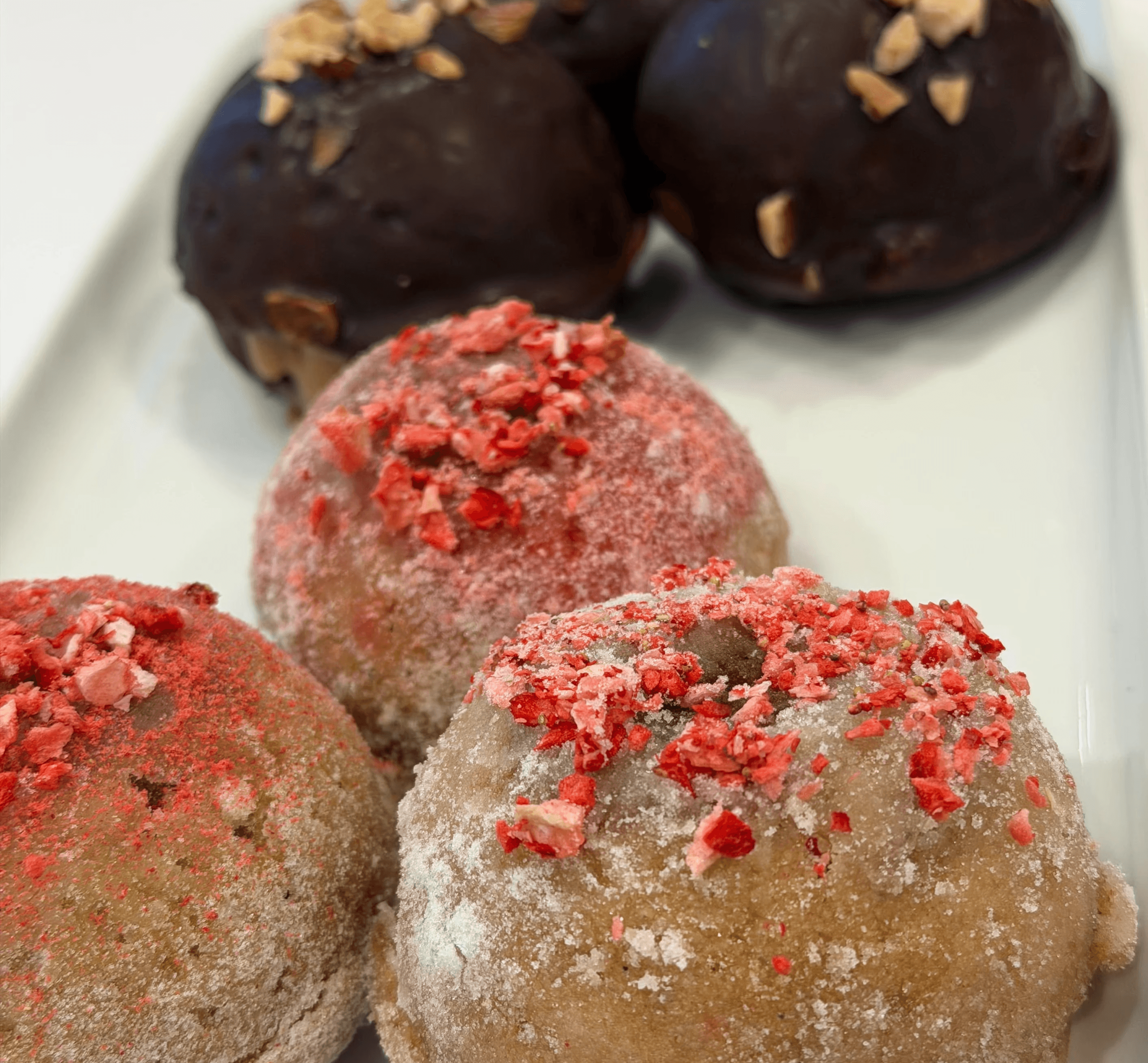 Sufganiyot — both classic and gluten-free — baked doughnuts with fillings like chocolate-caramel and sugar-raspberry